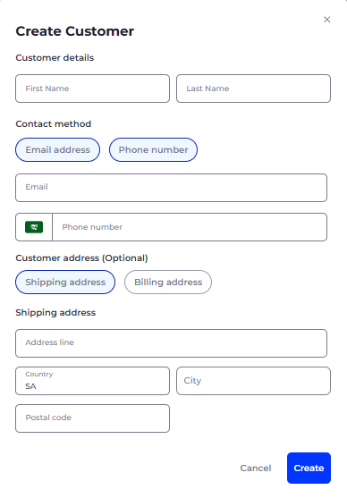 Allows you to search for an existing customer or to create a new one. A customer once created is saved for you to use later as well.