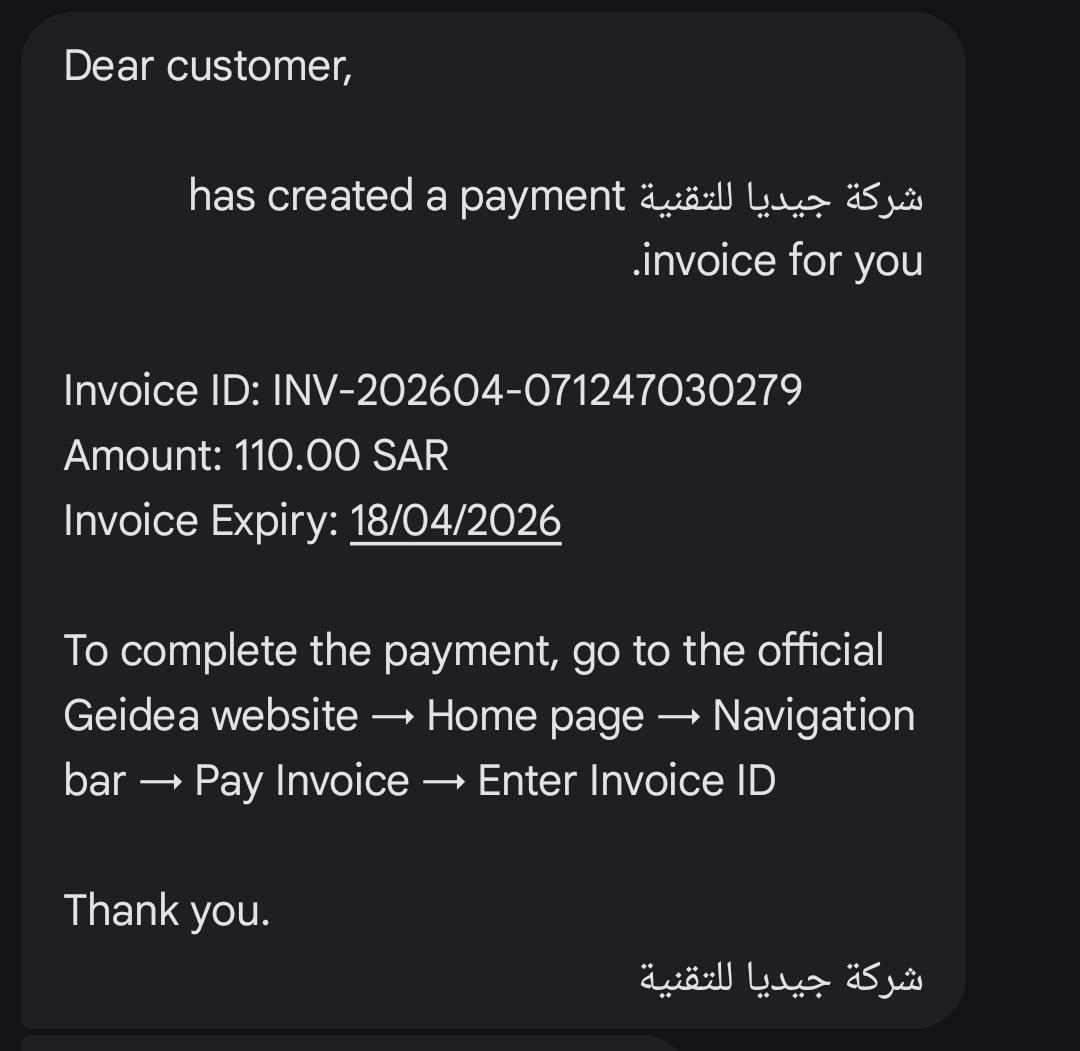 When the customer receives the Invoice ID, they can copy it and navigate to the official Geidea website. From the homepage, they should select “Pay Invoice” and enter the received Invoice ID.