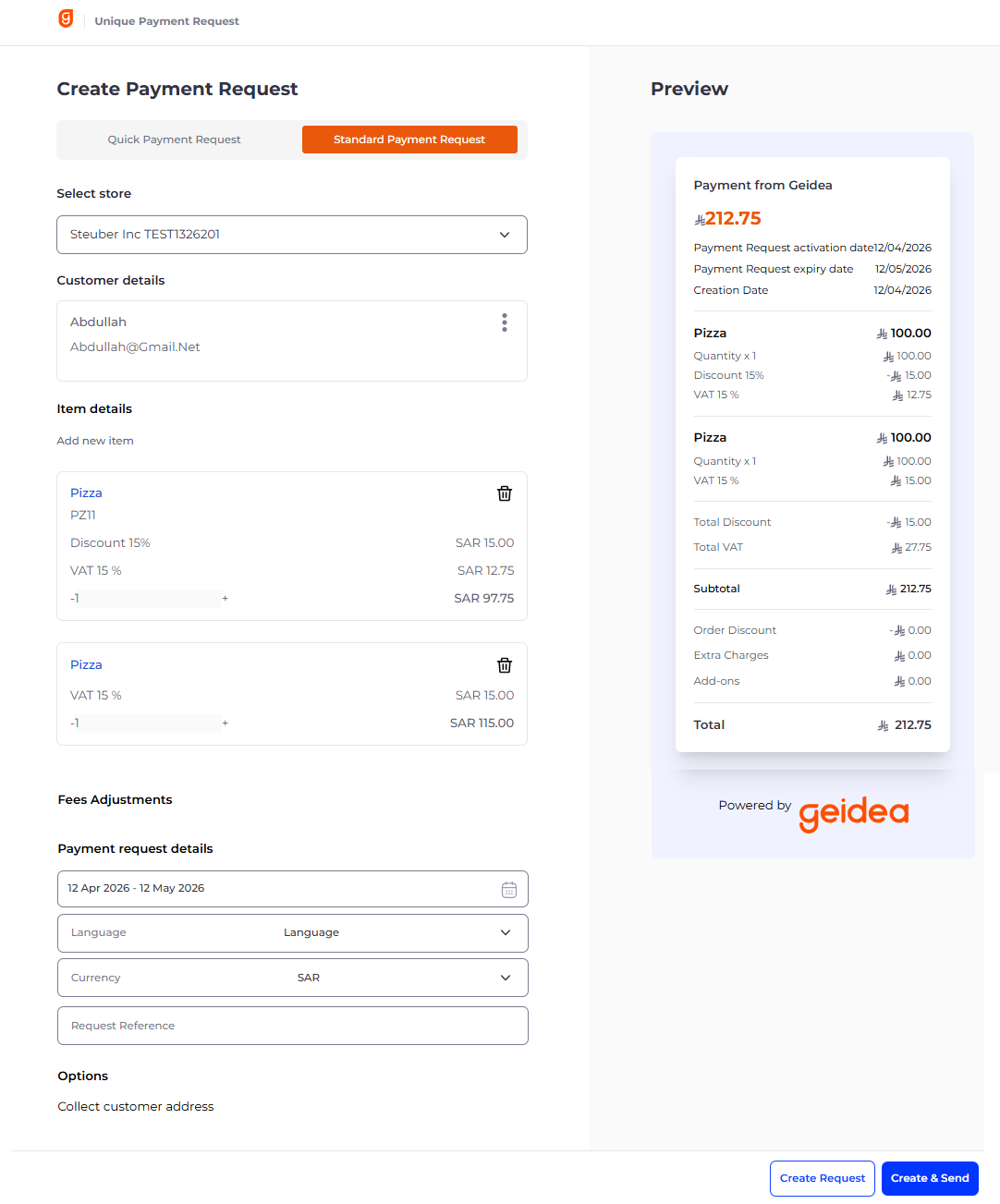 | Create a Standard Payment Invoice | Create a payment invoice with detail of your customer, product/service, discounts & charges and the option to collect your customer's shipping address. The payment invoiceId generated is sent by Geidea based on your customer's contact detail. |